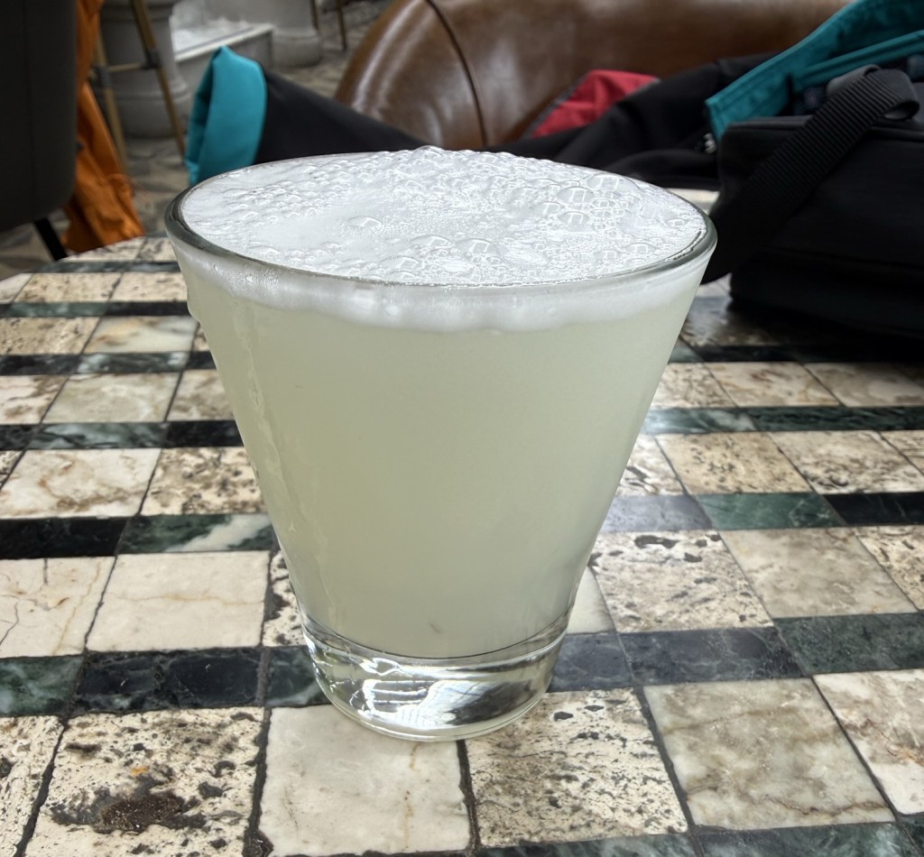 I had a delicious lunch in a hotel bar , with a glass ceiling and lots of plants. Not to mention a handsome waiter who had a great sense of humor. It was a good opportunity to have a Pisco Sour, a traditional Chilean drink. There were two versions of the drink on the menu, one simply a Pisco Sour, the other a Chilean Pisco Sour. I asked the waiter what the difference was, besides the higher price for the latter. He assured me the Chilean version, made from Chilean alcohol, was much better. 😃