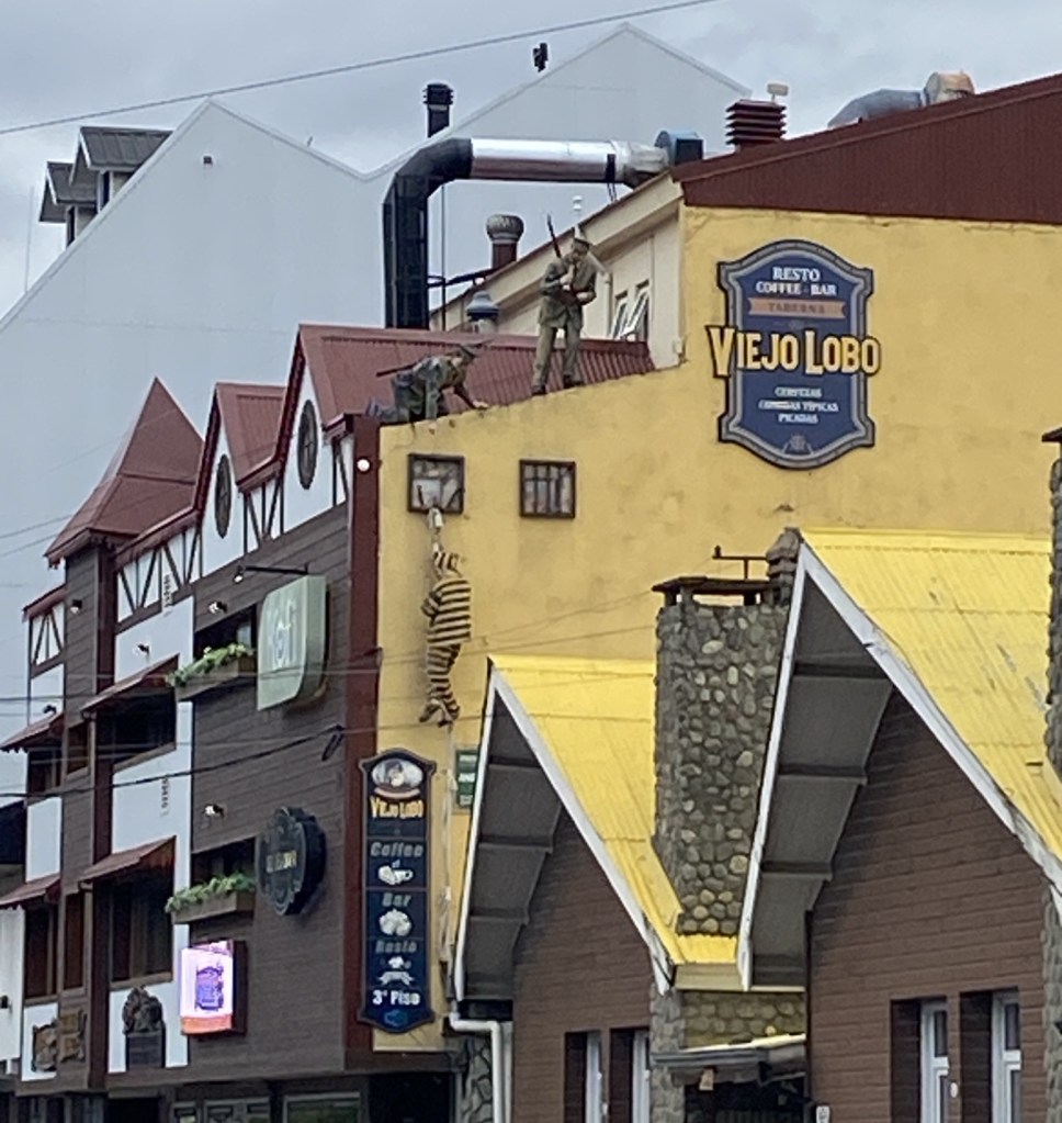 Ushuaia was originally a town that held a prison that made certain escape wasn’t an option. They have a sense of humor about it, shown by the cops chasing the escapee who is trying to climb out of the window above.