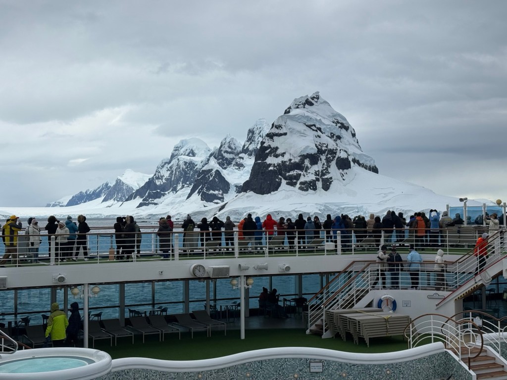 First we had to cross the Drake Passage, renowned for being one of the most difficult ocean passages in the world. Having tried to go around Cape Horn on a previous voyage, I was ready for anything. That trip ended in our turning around due to high seas and 90 knot winds. The ship was literally leaning several degrees. This time, however, the trip was comparatively smooth and I breathed a sigh of relief. The passage took an entire night and day, arriving at Paradise Harbour on the Antarctic Peninsula in the afternoon. That afternoon was mostly icebergs and mountains and I thought they were spectacular. It was only a pale hint of what was to come. I admit I was out on desk a short time, because we had 30 knot winds and the wind chill was in the minus numbers. We were constantly reminded to take care to keep everything under control, because Antarctica is a protected environment that doesn’t need random scarves and cell phones flying off the ship.