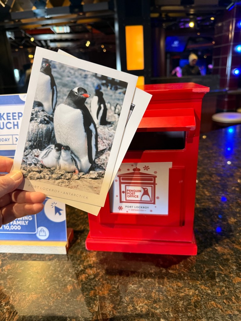 On the second day we sailed the Neumayer Channel to Port Lockroy, where the staff of the UK Port Lockroy station came aboard. The station is a UK Heritage site, and is manned only during the Antarctic summer. They spoke of life at the station, the history of the UK presence in Antarctica, and sold us post cards and stamps so we could send mail home from Antarctica. I was tickled to hear that they loved it when cruise ships invited them aboard, because it meant they could wash clothes and take hot showers!