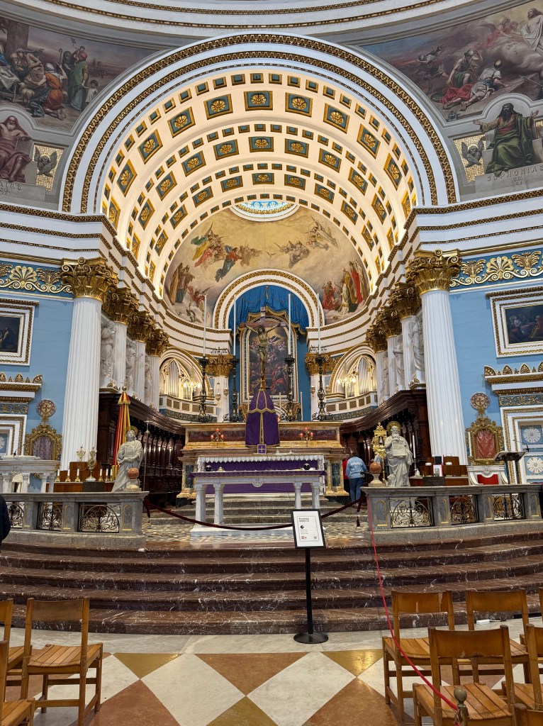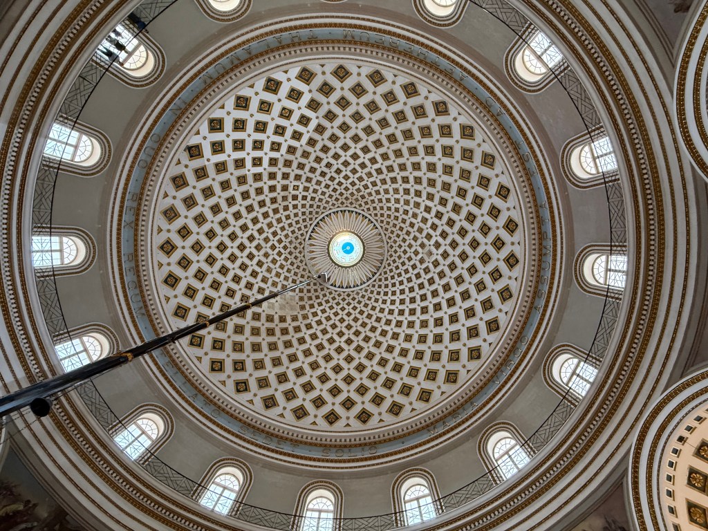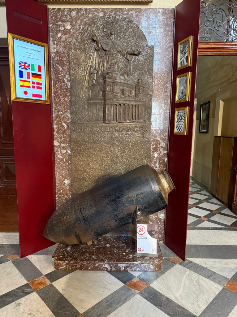 Most Maltese honor the church as the site of a miracle in WWII. Mass was being held during a bombing raid, and many parishioners stayed in the church rather than heading to the air raid shelter below. A bomb crashed through the dome and dropped near the altar, but didn’t explode.