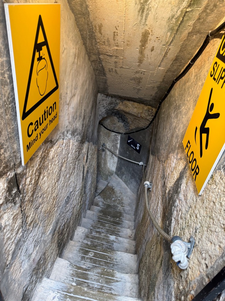 When you visit the church, you start your tour by climbing 78 stairs to the roof and a walkway around the inside of the dome. Then you take 78 steps down. After touring the inside of the church, you can visit the air raid shelter below. And guess what? More steps! I admit it was a challenge for this “lady of a certain age,” but I got it done. The air raid shelter was fascinating, and I now understand why some people were reluctant to use them. They are narrow and bleak, and during a raid were likely crowded. Sitting in that cave listening to the impact of the bombs had to have been terrifying.