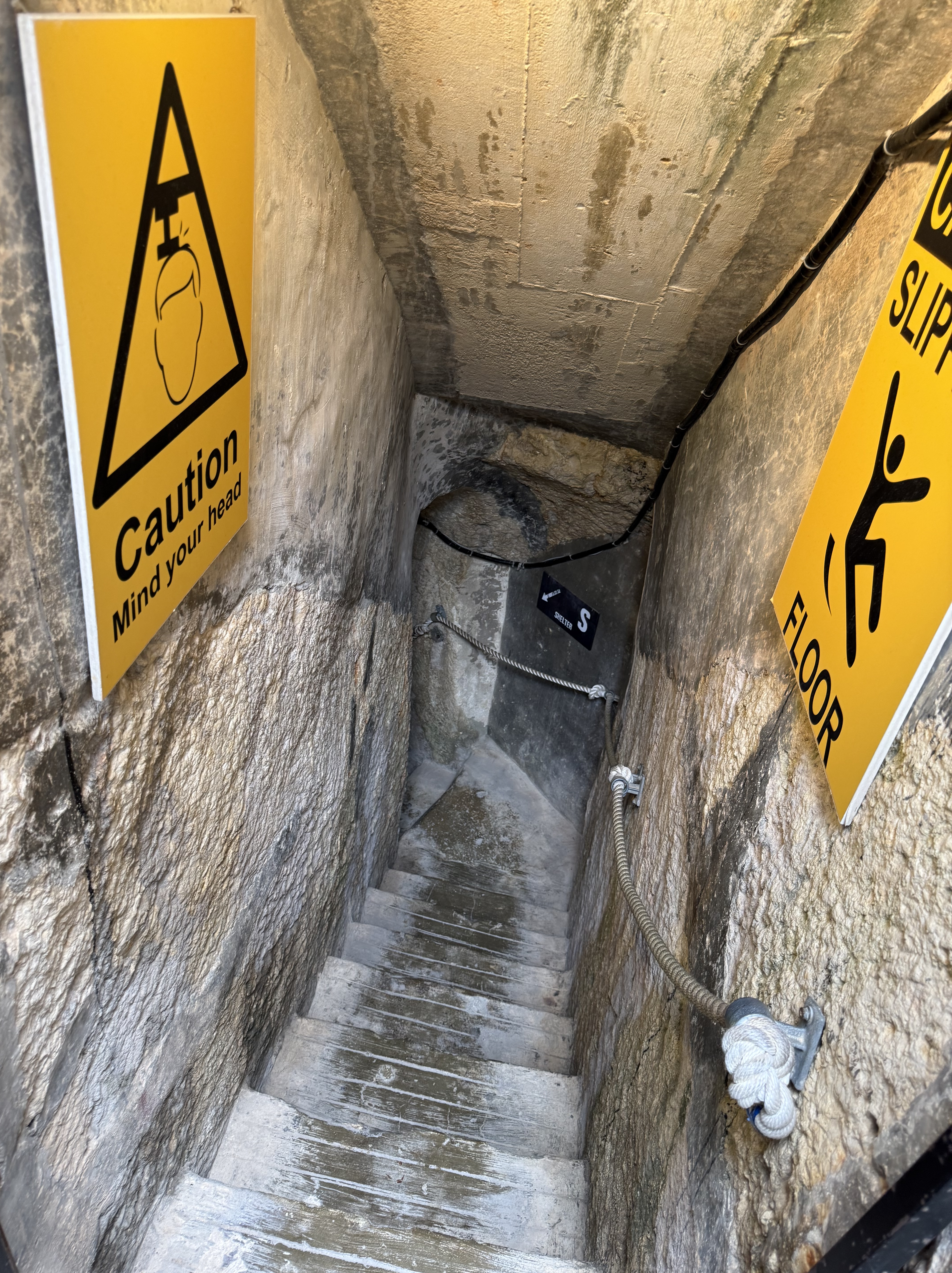 When you visit the church, you start your tour by climbing 78 stairs to the roof and a walkway around the inside of the dome. Then you take 78 steps down. After touring the inside of the church, you can visit the air raid shelter below. And guess what? More steps! I admit it was a challenge for this “lady of a certain age,” but I got it done. The air raid shelter was fascinating, and I now understand why some people were reluctant to use them. They are narrow and bleak, and during a raid were likely crowded. Sitting in that cave listening to the impact of the bombs had to have been terrifying.
