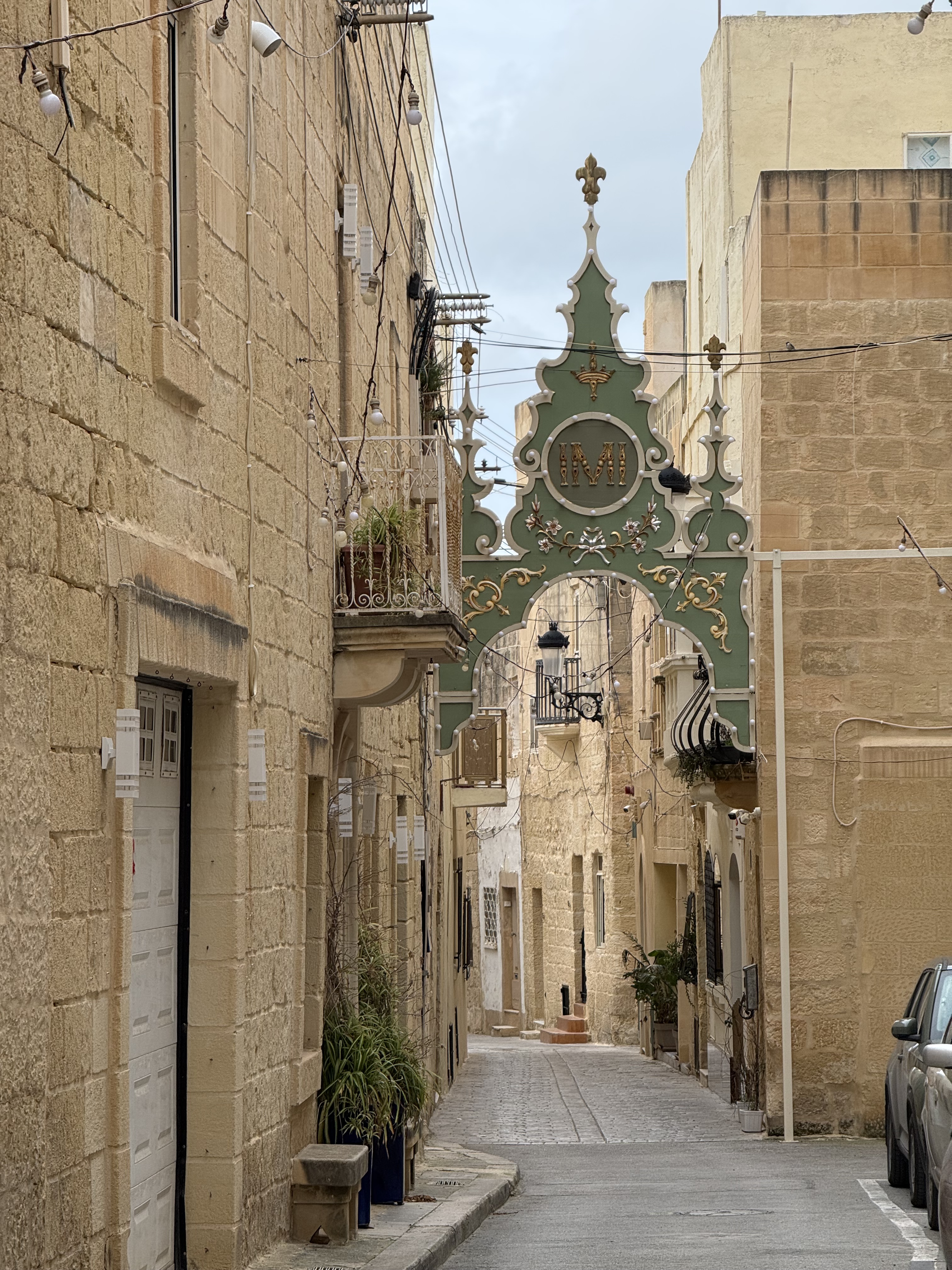 My tour of Gozo ended with time in the city of Victoria. There’s a lovely square with restaurants and shops where I had a great time purchasing gifts for friends and relatives and having conversations with local ladies who helped me decide on the perfect presents. While the cafes in the plaza were all very busy, I found a quiet rooftop restaurant (thank you, Apple Maps) that allowed me to sit above the fray and enjoy a spritzer while enjoying the view of the city. It meant climbing stairs up four flights, but well worth it.