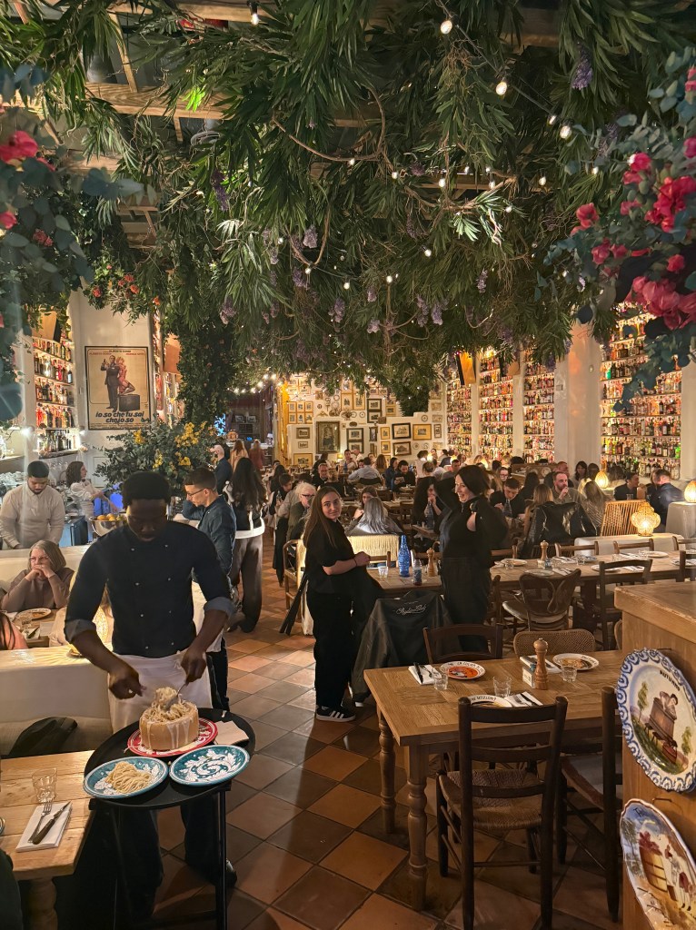 I also found a really good Italian restaurant, again thanks to my map app. Circolo Popular seems to be hidden away, sunken below street level. I walked past it twice before finding the entrance. But it was worth it. It reminded me of Mama Leone’s in New York City (which was an icon until it closed some thirty years ago.) Most of the seating was at long shared tables and the walls were lined with bottles. There was a party atmosphere, with lots of hustle and bustle. The food was great, and I ended up sharing comments on our meals with others who were sitting near me. While my meal was outstanding, I wish I had ordered the fettuccini alfredo. It’s prepared right at your table in a hollowed out parmesan wheel. Maybe I’ll have to go back and do that when I return in June.