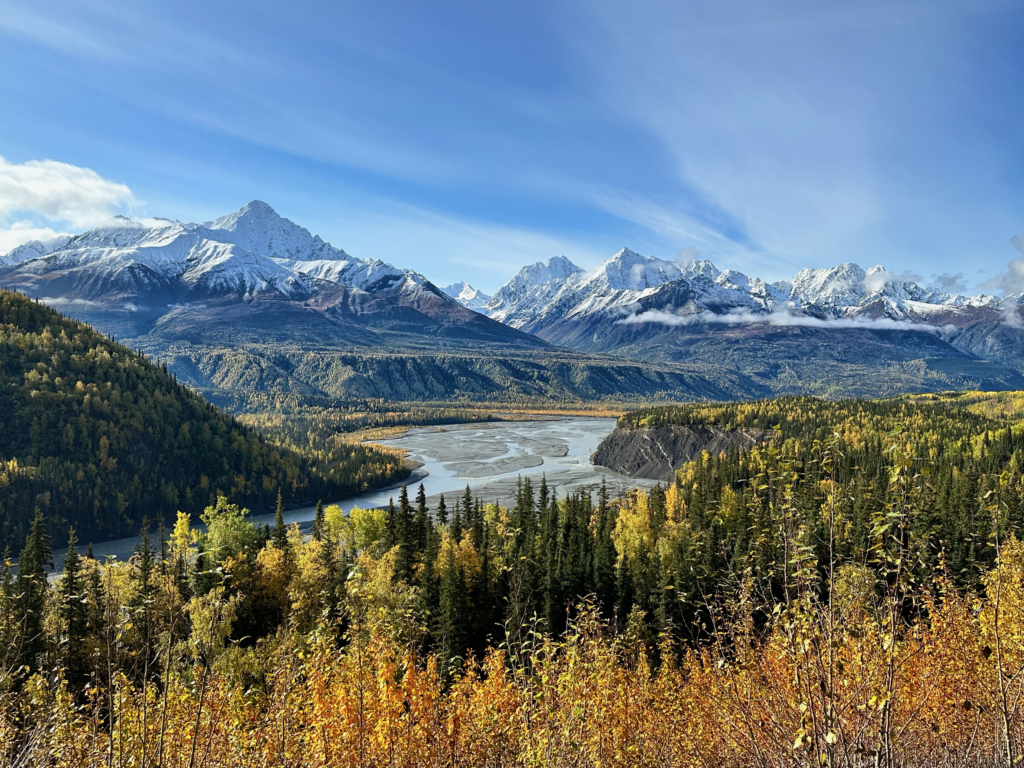 We are driving on the Parks Highway, which is one of the few major thoroughfares in Alaska. It connects Anchorage and Fairbanks, and was built in the early 1970s. Before then, the homestead communities in that area depended on the Alaska Railroad for transportation, mail, and freight. The little town of Ferry was one of those. There is a railroad bridge across the Nenana River, and just on the other side was a log cabin that served as the Post Office. The train would come through daily, exchange mail, and deliver boxes and packages. If you look down to the left you can see the river, and spot the occasional rooftop of a homestead in the far-flung community of Ferry.