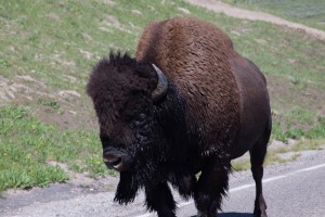 One thing you look forward to in the park is a traffic jam-it usually means wildllife nearby. Sometimes it means a slow moving vehicle in the roadway….like a bison! In this case the bison was in the oncoming lane and the traffic was backed up behind him and following him. He was all wet, and probably coming back from his bath in the nearby river.